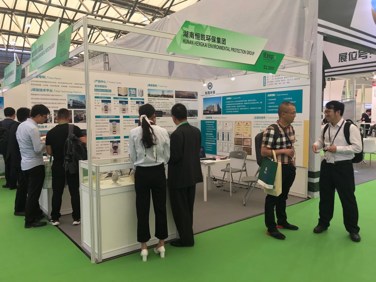 恒凱環(huán)保的展位位于E2-2551,精致的展位布局展示了公司的基本情況、自主研發(fā)的產(chǎn)品、技術(shù)和典型項目案例,吸引了眾多國內(nèi)外客戶駐足觀看。工作人員就產(chǎn)品和相關(guān)技術(shù)解決方案與前來我公司展位參觀交流的客戶進(jìn)行溝通,并詳述了修復(fù)劑產(chǎn)品和技術(shù)在市場的優(yōu)勢,現(xiàn)場交流互動不斷。參觀人員對我公司修復(fù)劑產(chǎn)品以及土壤修復(fù)和場地修復(fù)技術(shù),污水處理工藝等進(jìn)行了深入了解并給予高度評價,期待能進(jìn)一步探討技術(shù)與合作。
