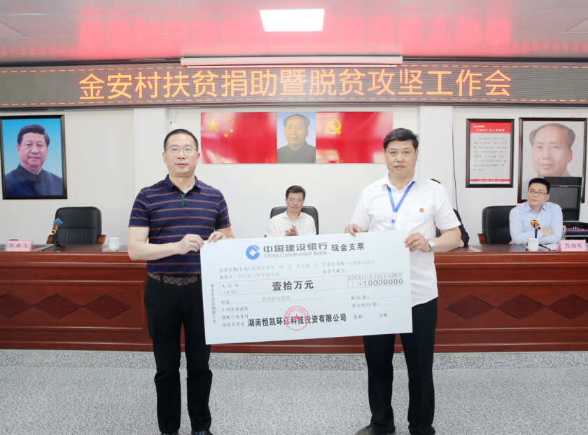▲恒凱環(huán)保副總裁莫唐文代表公司向金安村捐贈(zèng)產(chǎn)業(yè)扶貧建設(shè)資金10萬(wàn)元