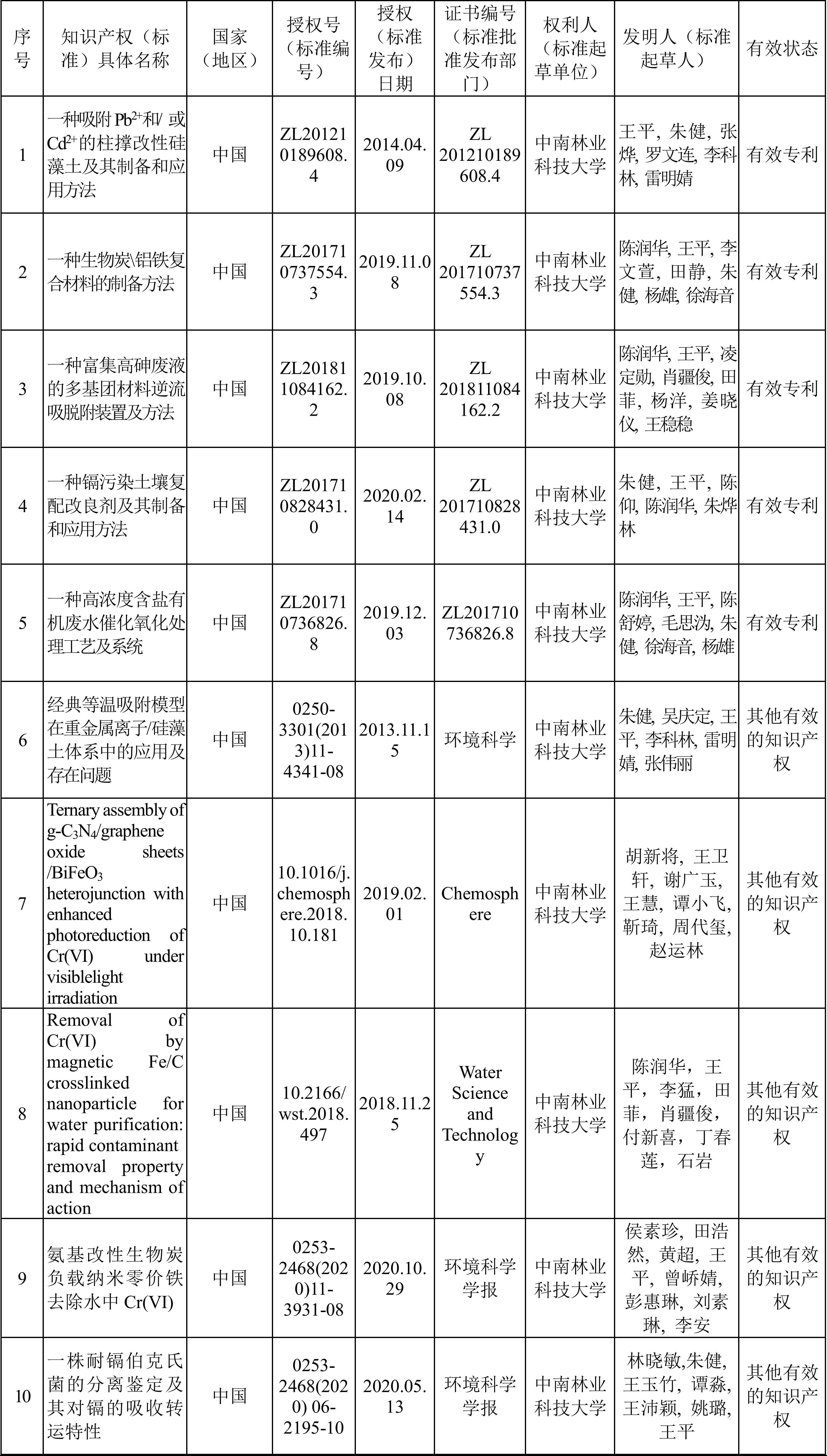 1、王平、朱健、雷明婧擁有多項(xiàng)共同知識(shí)產(chǎn)權(quán):(1)專利:一種吸附Pb2+和/ 或Cd2+的柱撐改性硅藻土及其制備和應(yīng)用方法;(2)論文:硅藻土基多孔吸附填料的制備及其對(duì)Pb2+的吸附;(3)論文:經(jīng)典等溫吸附模型在重金屬離子/硅藻土體系中的應(yīng)用及存在問題。